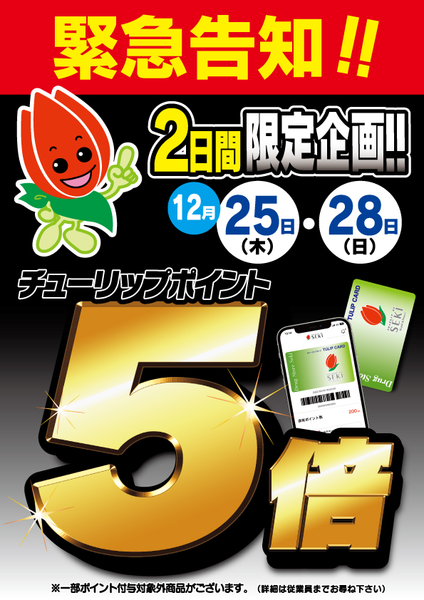 年末特別企画!12/25(木)12/28(日)全店チューリップポイント5倍デー!